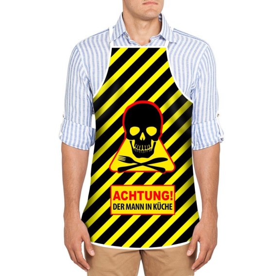 Napis na produkcie: Achtung! Der Mann in Küche. Produkt w niemieckiej wersji językowej.