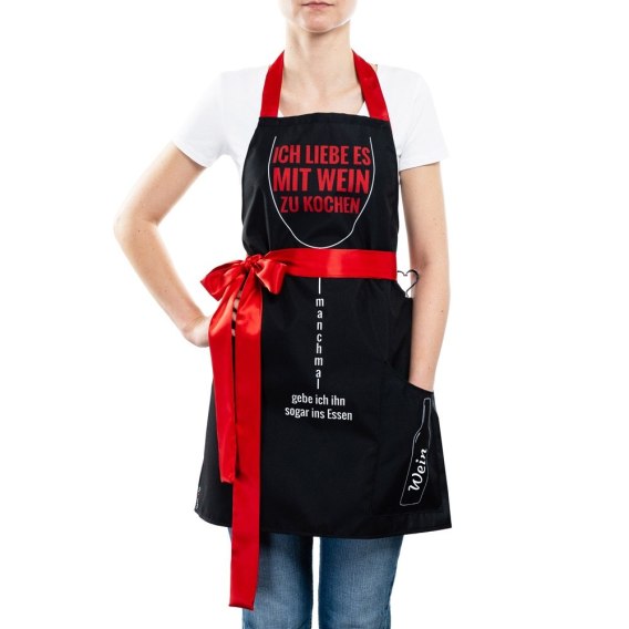 Gotowy do wręczenia na prezent bez konieczności dodatkowego pakowania. Napis na produkcie: Ich liebe es mit Wein zu kochen. Manchmal gebe ich ihn sogar ins Essen. Produkt w niemieckiej wersji językowej.