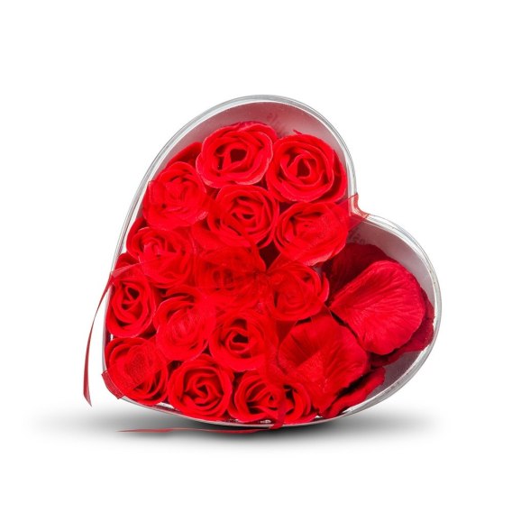 Zestaw składa się aż z 600 czerwonych, syntetycznych płatków róż (które wyglądają jak prawdziwe, ale są o wiele bardziej trwałe) i 14 pięknych pachnących mydełek w kształcie różanych pąków. Zostały one wykonane z aromatycznego mydła, które rozpuści się powoli, uwalniając różany aromat. Jest to wspaniały, elegancki prezent na każdą okazję zarówno dla singli, jak i zakochanych par.