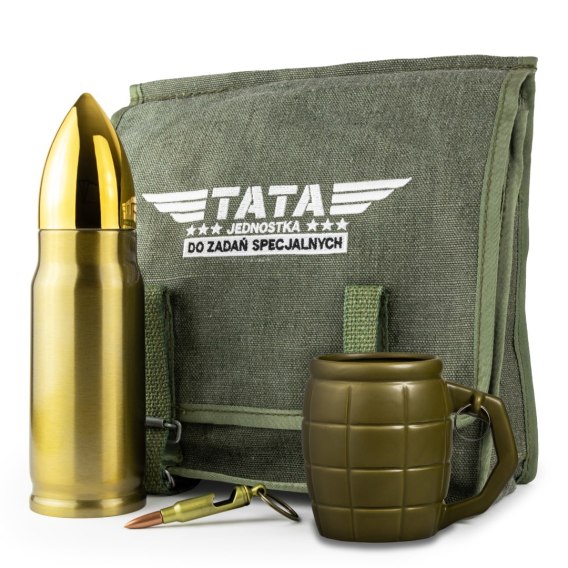 Zestaw "Jednostka do Zadań Specjalnych" jest nie tylko symbolem siły i determinacji, ale także dowodem na to, że dostrzegamy i doceniamy wszystkie jego starania. W skład zestawu wchodzi niezwykły termos w kształcie pocisku, intrygujący otwieracz do butelek oraz kubek w kształcie granatu. Oryginalna, klasyczna wojskowa torba polskiej armii, dodaje całości niepowtarzalnego charakteru.